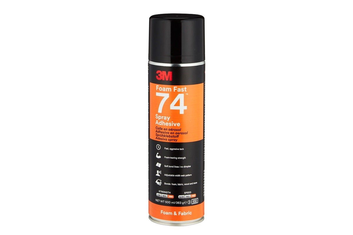 Il top adesivo spray a rapida adesione 3M Scotch-Weld 74 incolla schiume poliuretaniche o in lattice flessibili tra loro e ad altri materiali (legno, metallo, plastica, ecc.).