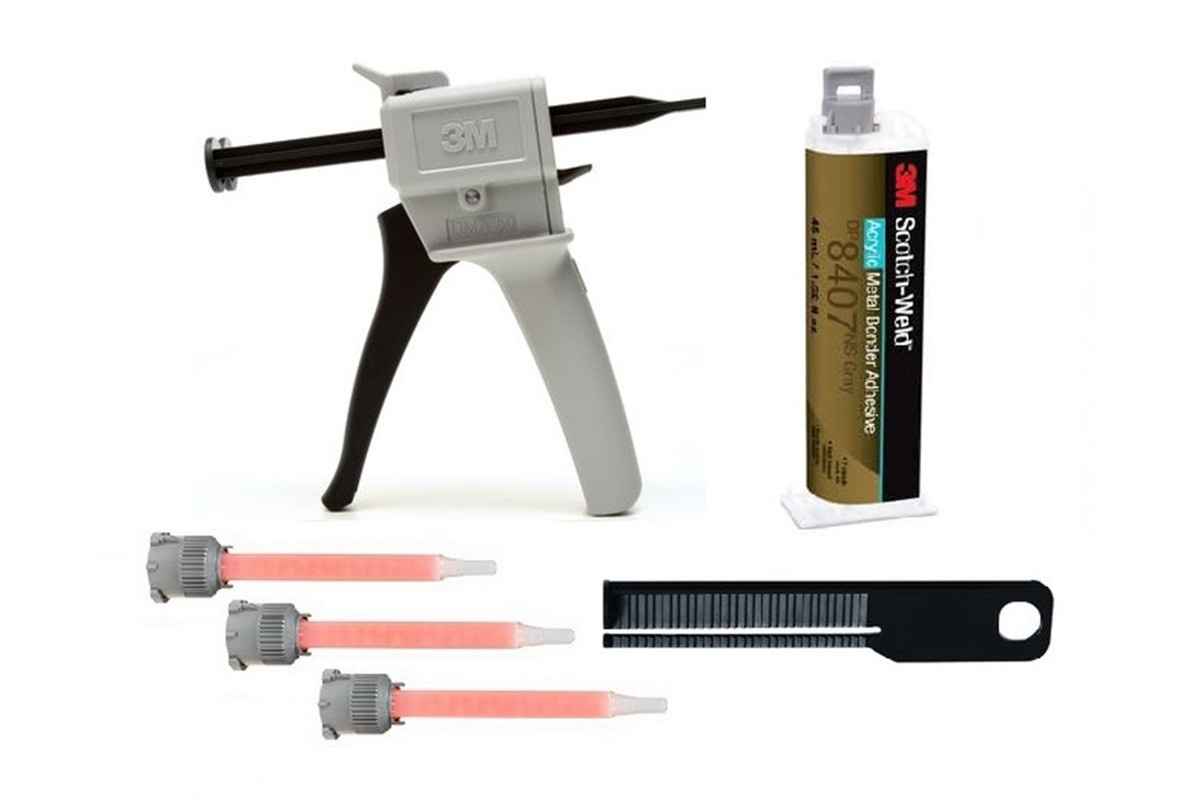 Il Kit di Avvio per l'incollaggio strutturale 3M per metalli include l'adesivo 3M DP8407 NS, un applicatore, un pistone di estrusione e tre ugelli miscelatori a un prezzo significativamente inferiore rispetto all'acquisto separato dell'adesivo e dell'attrezzatura di applicazione. 3M Scotch-Weld DP8407 NS è un adesivo acrilico bicomponente ad alte prestazioni di colore grigio, che offre eccellente resistenza al taglio e al distacco e resistenza agli urti. Ha un'eccellente adesione su molti tipi di plastica e metalli. Prima dell'incollaggio richiede solo una pulizia o sgrassatura minima. L'adesivo offre un'eccellente durata delle giunzioni sui metalli (inclusi acciaio grezzo, rame, ottone, bronzo e acciaio zincato), anche quando sono esposti ad alte temperature e ambienti umidi. Tempo di lavorazione: 5-7 minuti. Raggiungimento della resistenza strutturale: 32 minuti. Parametri tecnici sistema: adesivo bicomponente, 10:1, base EPX: metilmetacrilato resistenza termica: 150 °C resistenza ai raggi UV: molto buona resistenza all'umidità: molto buona resistenza ai prodotti chimici: molto buona applicazione: con applicatore da cartuccia doppia EPX