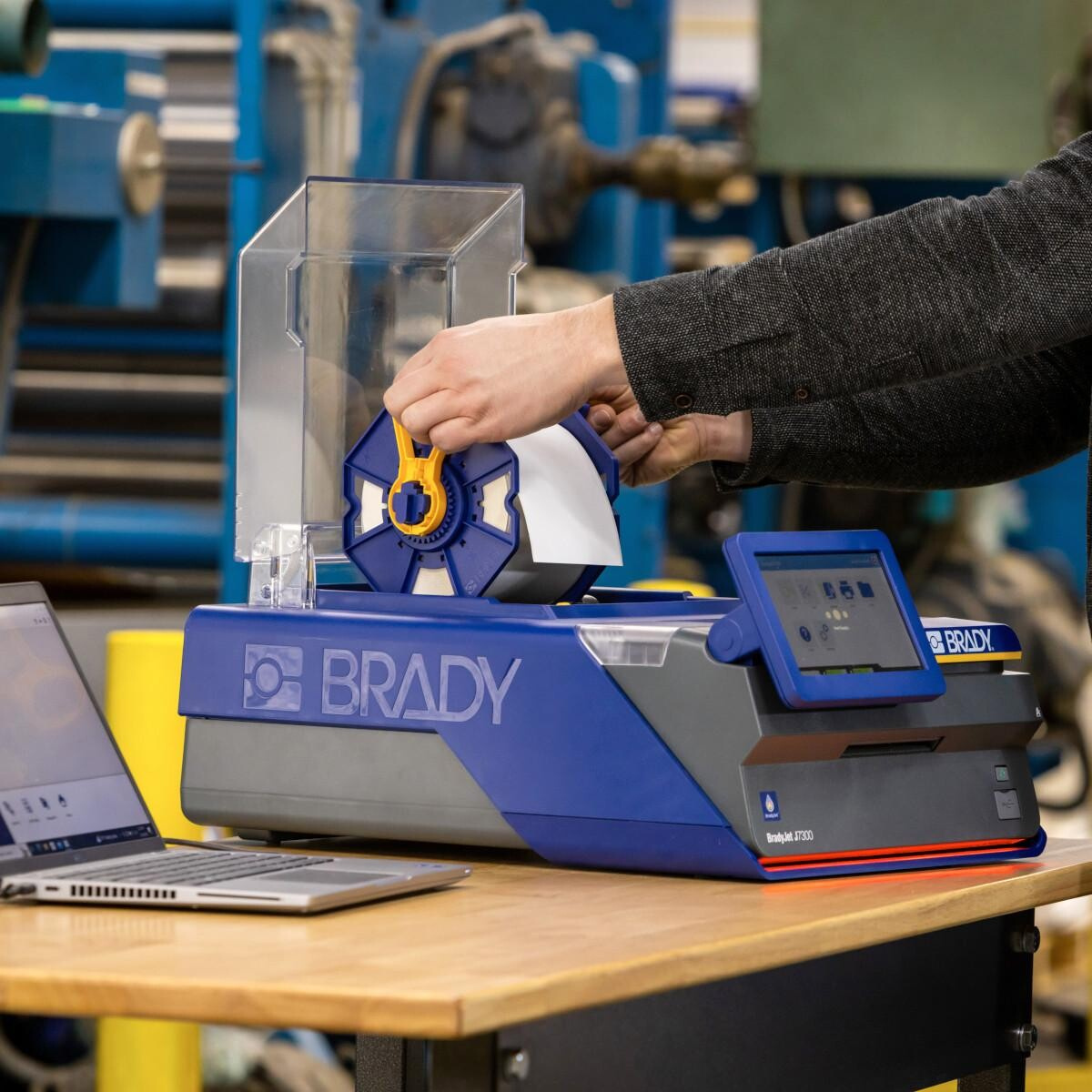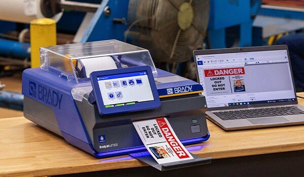 Stampante di etichette a colori Brady J7300-EU per uso industriale con tecnologia di stampa a inchiostro.