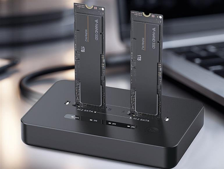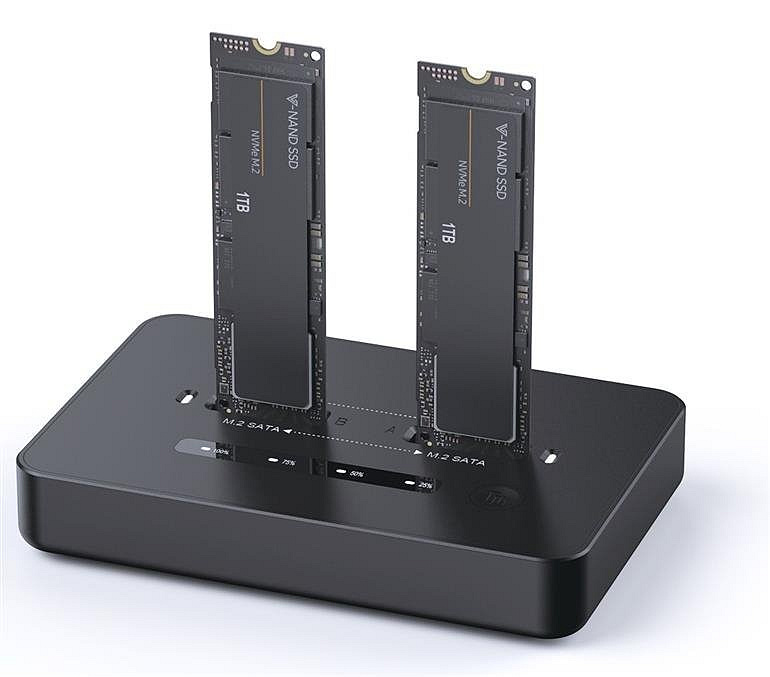 torna all'elencoDokovací stanice se dvěma disky: USB typu C M.2 NVMe (a SATA) SSD, černá.