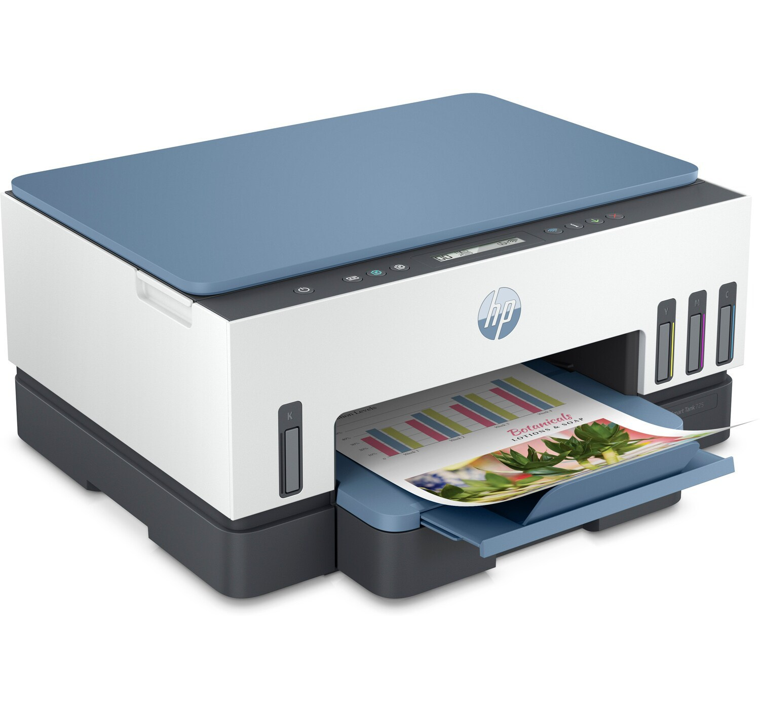 Contenuto della confezione: HP Smart Tank 725 All-in-One; 3x 135ml bottiglia originale di inchiostro nero HP GT53XL; Bottiglia originale di inchiostro ciano HP GT52; Bottiglia originale di inchiostro magenta HP GT52; Bottiglia originale di inchiostro giallo HP GT52; Cavo di alimentazione; Testina di stampa nera HP; Testina di stampa a tre colori HP; Guida all'installazione; Manuale di riferimento; Volantino di avviso sull'inchiostro; Volantino normativo; Volantini di garanzia; Ulteriori informazioni sul riempimento e sul rendimento sono disponibili all'indirizzo http://www.hp.com/go/learnaboutsupplies