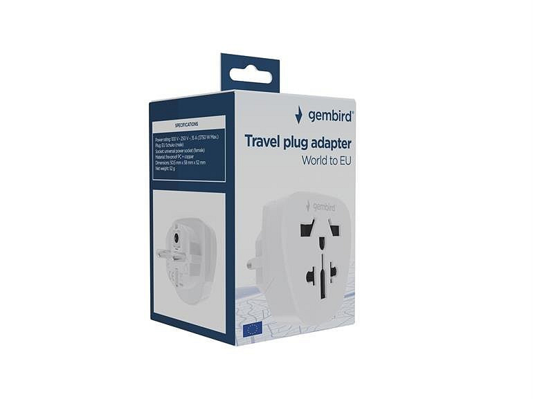 Questo adattatore consente di collegare qualsiasi dispositivo elettrico alle prese standard dell'UE. Funziona con spine di oltre 200 paesi. Caratteristiche Adattatore da viaggio La spina con messa a terra si adatta a qualsiasi presa standard nell'UE. La presa universale accetta spine da oltre 200 paesi. Specifiche Potenza nominale: 100–250 V AC, 15 A (max. 3750 W). Spina: EU Schuko (maschio). Presa: Presa universale (femmina). Materiale: PC ignifugo + rame. Dimensioni: 50 x 49,5 x 49,5 mm. Peso netto: 53 g.