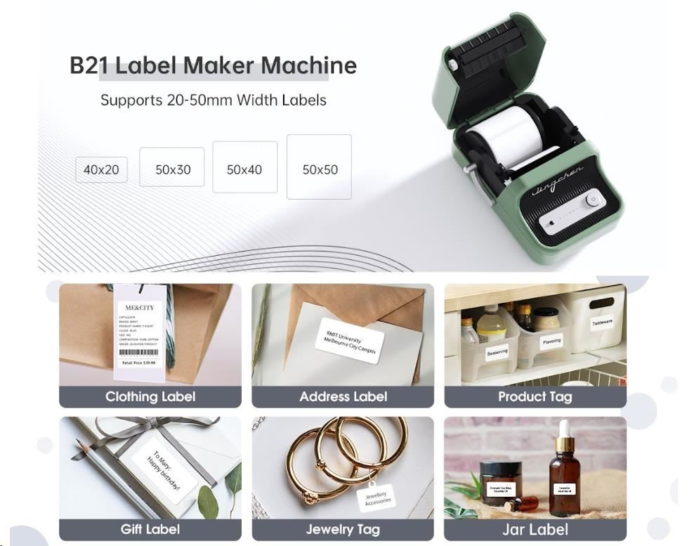 Il modello Niimbot Smart B21 è dotato di una batteria al litio ricaricabile con capacità di 1500 mAh, che garantisce fino a 5 ore di funzionamento continuo con una singola carica. Offre stampa ad alta risoluzione 203 dpi, larghezza di stampa fino a 50 mm e velocità fino a 60 mm/s. La stampante supporta la stampa orizzontale e verticale, la creazione di codici a barre e QR, numeri seriali, cornici e testi — una scelta ideale per l'etichettatura di prodotti, pacchi, cartelle o scaffali.