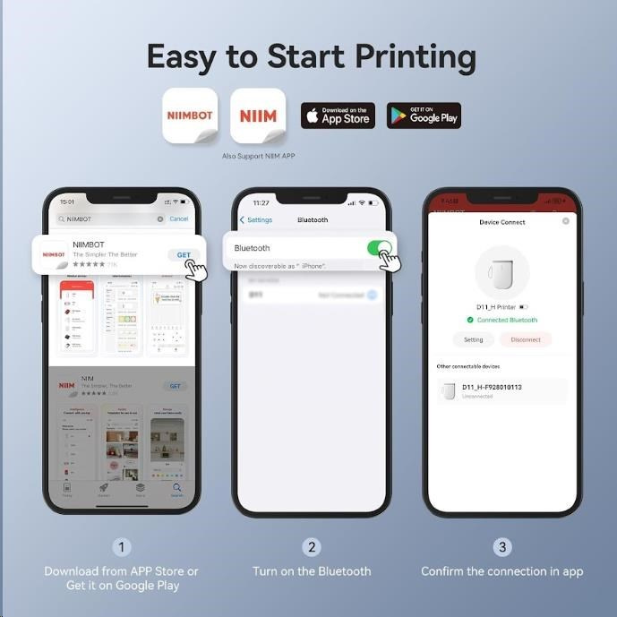 È compatibile con l'applicazione Niimbot App disponibile per Android e iOS, quindi puoi comodamente progettare e stampare etichette direttamente dal tuo smartphone o tablet.Questo modello offre risoluzione di 300 dpi, larghezza di stampa fino a 12 mm e supporta nastri di larghezza 12–15 mm, garantendo un output nitido, leggibile e professionale. Il nuovo modulo Bluetooth consente la connessione fino a sei dispositivi contemporaneamente, ideale per un ambiente di lavoro condiviso.