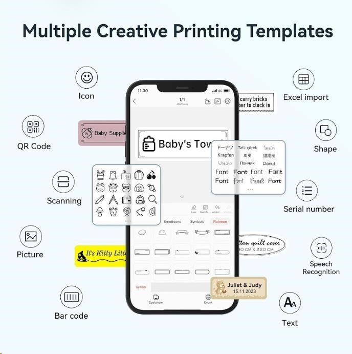 Grazie all'applicazione Niimbot App, disponibile per Android e iOS, puoi facilmente progettare etichette, cambiare font, aggiungere icone, codici a barre e QR o cornici. L'etichettatrice si adatta automaticamente al nastro inserito e garantisce un formato di stampa perfetto.
