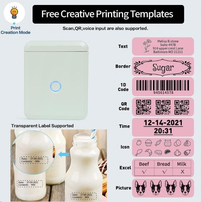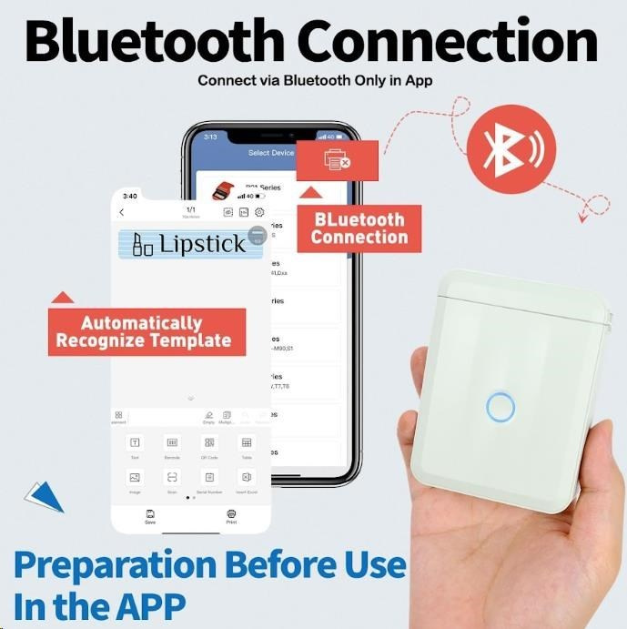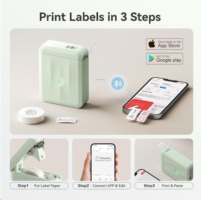 Grazie alla connessione Bluetooth e all'app gratuita Niimbot App per Android e iOS, puoi progettare e stampare etichette direttamente dal tuo telefono o tablet. L'app offre più di 1500 icone, 100 cornici e 19 font, così puoi personalizzare le tue etichette nei minimi dettagli.