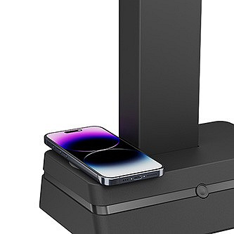 Permette di ricaricare comodamente e rapidamente i dispositivi compatibili direttamente sul supporto, così da avere sempre il telefono a portata di mano e mantenere lo spazio di lavoro pulito e ordinato senza cavi inutili.