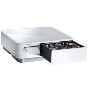 Cash drawer-receipt printer combination, front opening, dimensions (WxHxD): 308x100x300mm, insert: 4 bill, 6/8 coin, 1 check, printer: direct thermal, media width (max): 58mm, roll diameter (max): 50mm, printing speed (max): 100mm/sec, interfaces: 3x USB-A, 1x USB-C (for iOS), 1x USB-B, Bluetooth (5.0), includes: Power cable (EU, UK), USB cable (USB-A/USB-B, white), tablet holder (double-sided), receipt roll, color: whiteScaricare